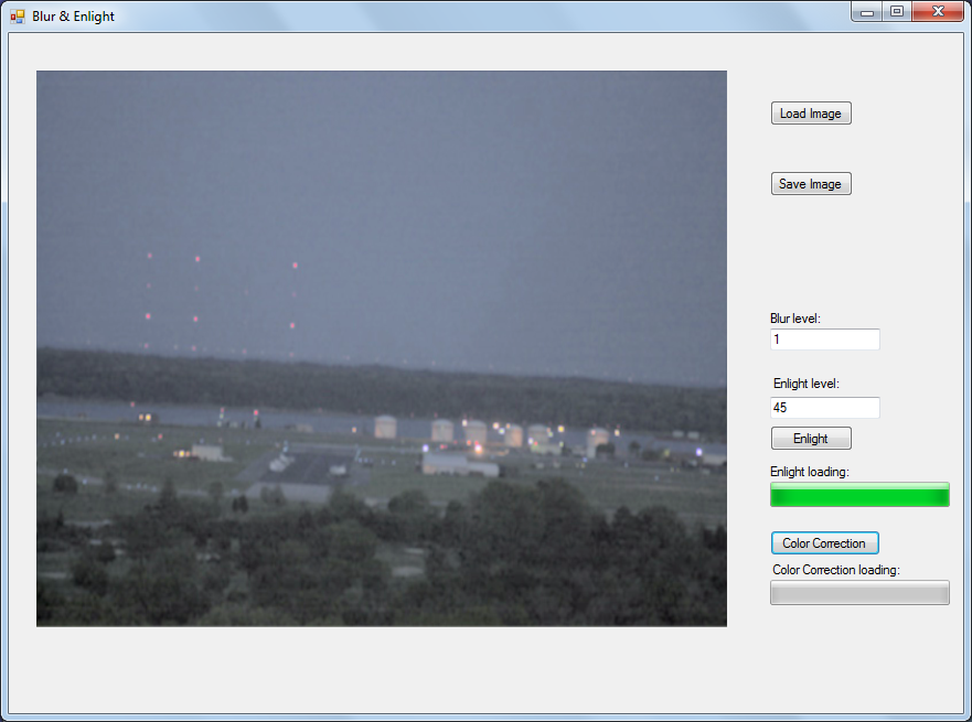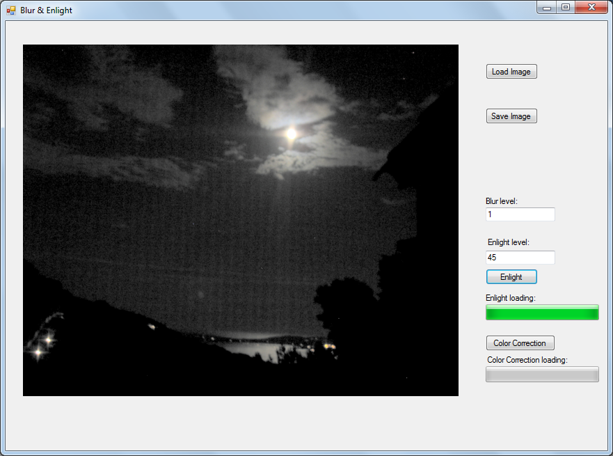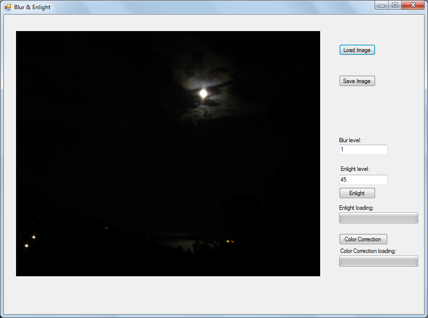 This program is used for enlightenment of dark images. Program algorithm is based on ideas from a Retinex algorithm. At first it creates a blurred version of an input image and then the enlightened image is made, based on the previous result.